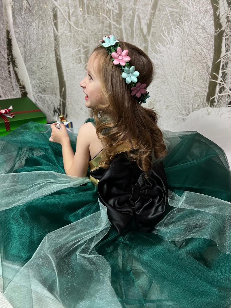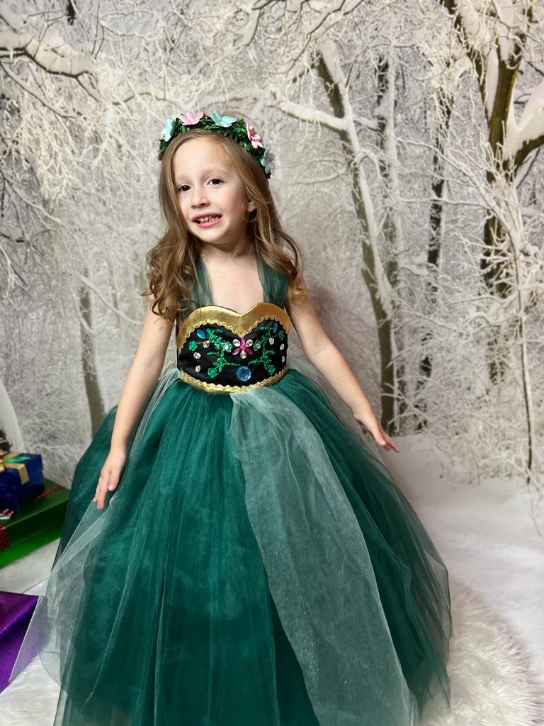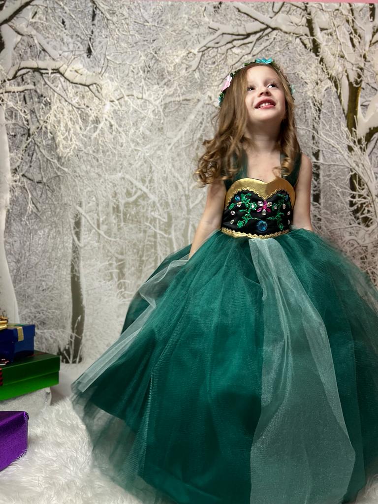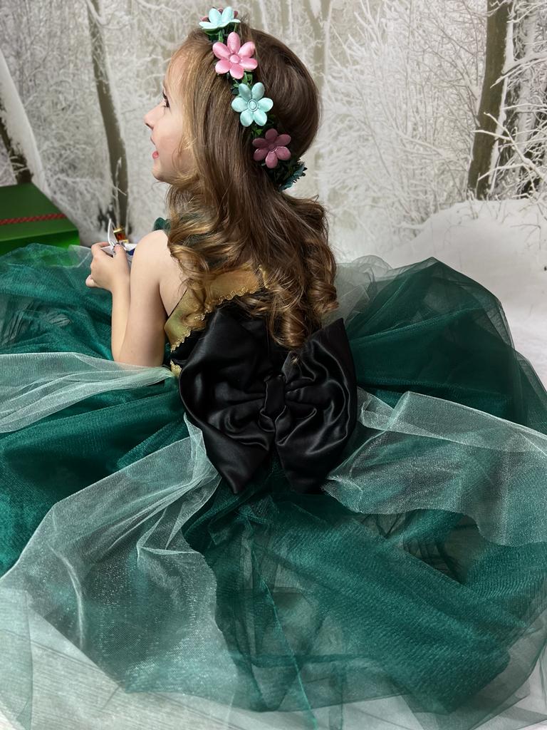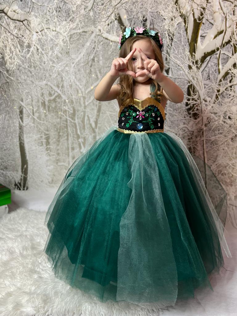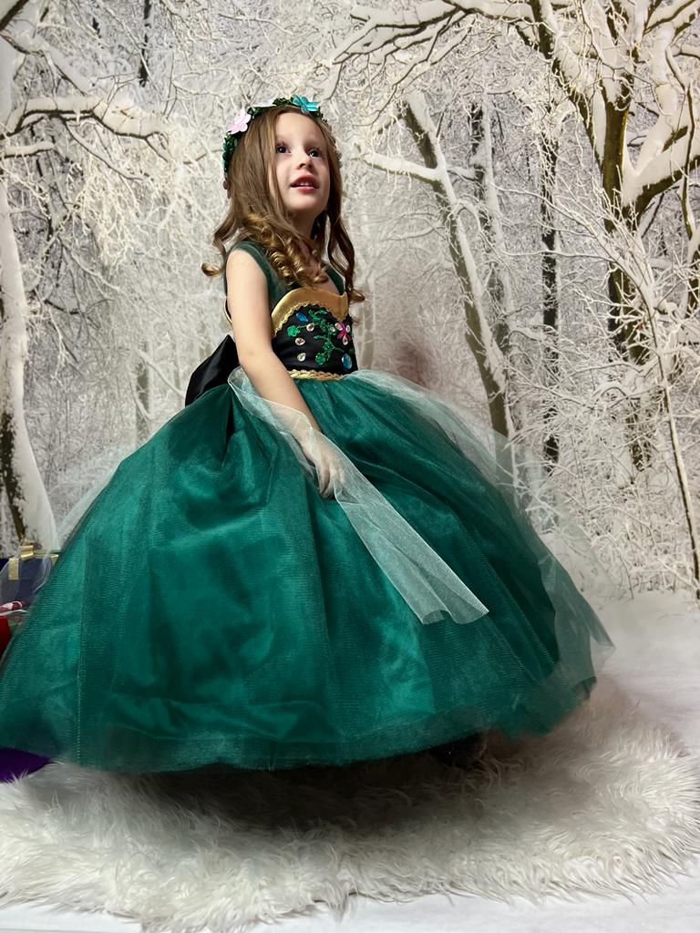 The magnificent dress of the princess Anna has a new design and emerald green weighted gold details. The embroideries on it are made with lace and stones.. There is a hoop under our very fluffy dress.. It can be used with or without a hoop.. A black bow on the back is made to give the dress an elegant look. image given..