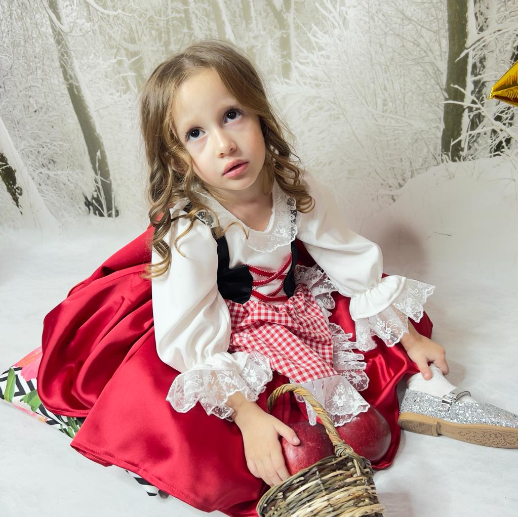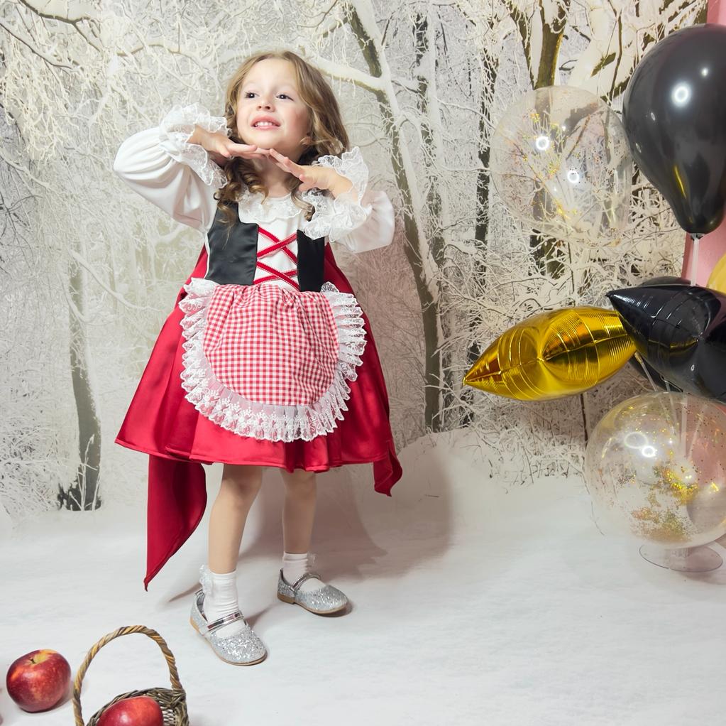 Little girls will look very, very cute in this dress with a red cape, red fluffy skirt, gingham apron, and ribbon detail on the top! The glittering top of the dress will excite girls! The lace of the gingham apron, the cap of the red cloak and every detail of this dress were thought for children! If you want to witness your daughter's big smile at a birthday party or a costume party, the Red riding hood dress is for you!