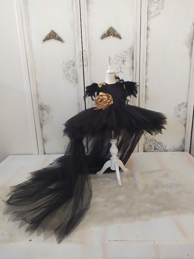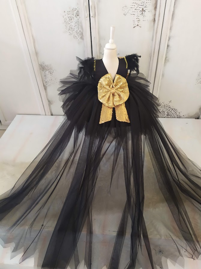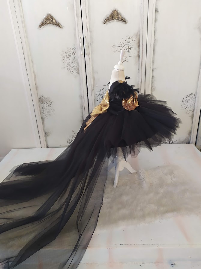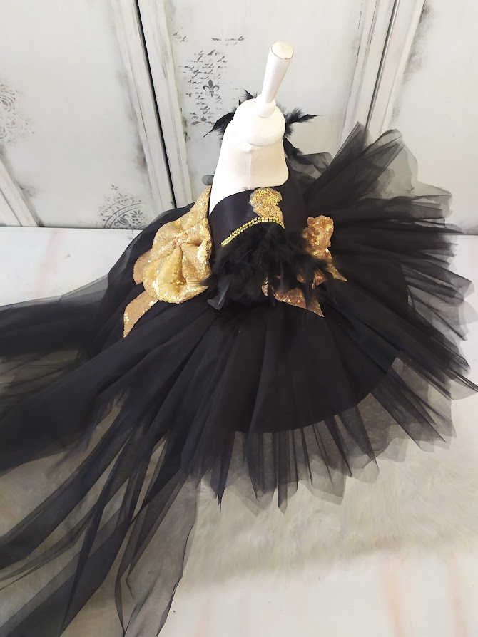 - We completed the nobility of black with gold details..a wonderful black tutu flower dress with train tail emerged..we sewed an elegant