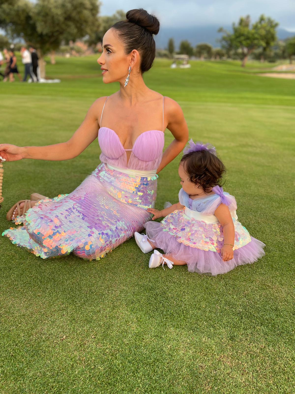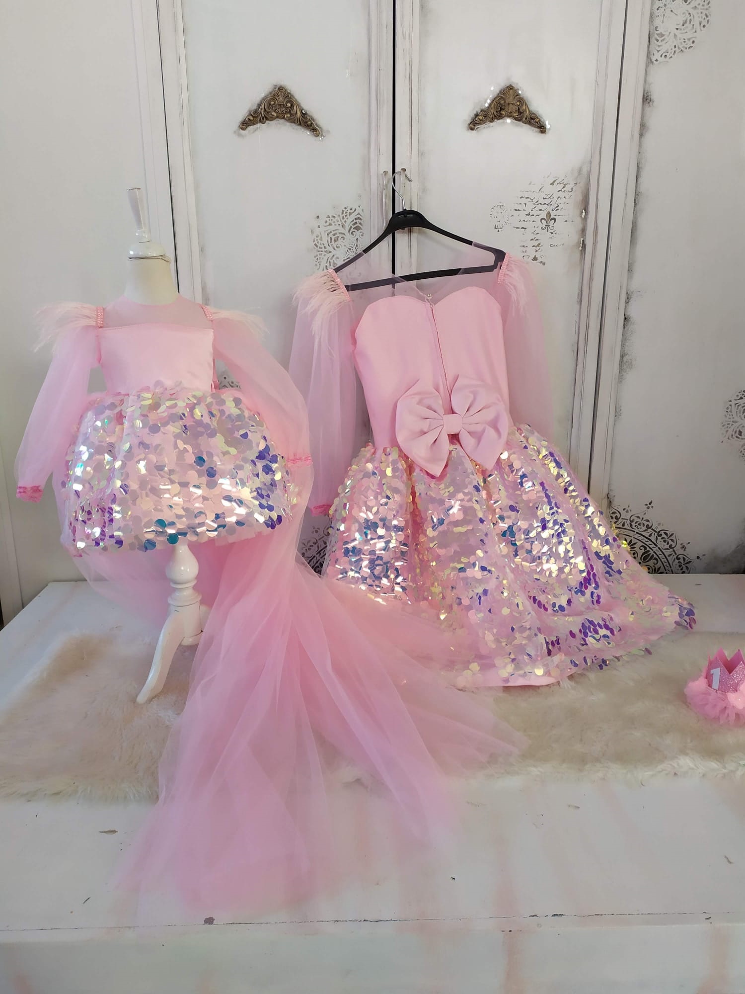 Our mother-daughter matching pink dress is very cool...we claim that you and your princess will dazzle...in this dress I designed with sequin fabric that changes color on the skirt and tulle on the sleeves, I added a snappy tail to make your little princess look like a swan...for your mother's elegance I designed a dress with a big bow on the back and a fitted waist... Your little princesses will dazzle with this dress. Perfect for birthdays, photo shoots or parties.